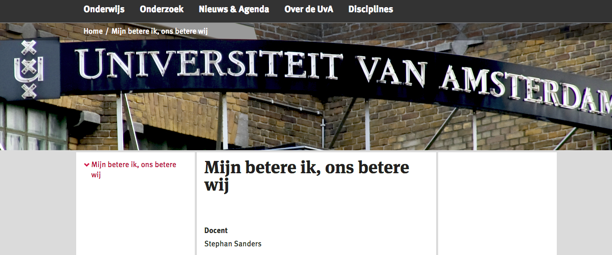 In het eerste semester van 2018 organiseerde de Universiteit van Amsterdam samen met De Groene Amsterdammer een lezingencyclus Mijn betere ik, ons betere wij. Stephan Sanders, journalist en schrijver was de moderator, studenten en andere geïnteresseerden vormden het publiek. Op 4 april was ik de spreker. In bewerkte vorm verscheen de lezing in De Groene van 1 augustus 2018.