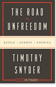 The Road to Unfreedom van Snyder is een minstens zo somber boek. Snyder laat en detail zien hoe Rusland een totalitaire weg is ingeslagen en welbewust en planmatig westerse democratieën bedreigt. De campagnes die vanuit Rusland worden gevoerd hebben leugens en onvrijheid als exportartikel, en ze zijn gericht op het destabiliseren van westerse samenlevingen. Gebruik makend van nieuwe technologie weten de Russen in te spelen op gevoeligheden en onvrede die bij een deel van de westerse bevolking leven. Vooral bij rechtse groeperingen slaan de Russische campagnes aan, maar ook delen van links blijken gevoelig te zijn voor de retoriek van president Poetin en zijn politieke technologen.