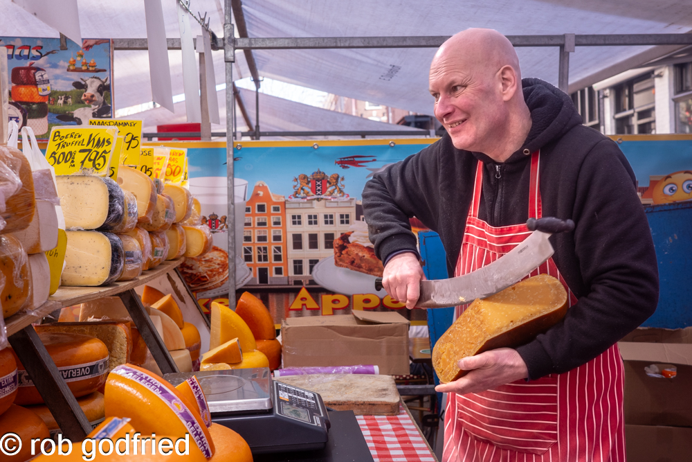 Johan komt uit een familie met een traditie van handel, op de markt en ook daarbuiten. De ouders van zijn grootvader waren gescheiden. Dat werd destijds als een schande ervaren, en het maakte dat ze het thuis niet breed hadden. Johans grootvader ging daarom al jong op pad om manden vis te venten, in de Jordaan en in de Kinkerstraat. Zijn ooms hadden een viswinkel. Het was zwaar werk voor een kleine jongen. Je mocht niet te lang stil staan, want venten was eigenlijk verboden. Johans grootvader hield op met de vishandel toen zijn beste vriend een snoepfabriekje begon. Hij ging met snoep op de markt staan, op de hoek van de Kinkerstraat. Zijn zoon, Johans vader, hielp hem van jongs af aan, totdat zijn vader een kaaswinkel voor hem kocht in de Kinkerstraat. Later werd die afgebroken en kwam Johans vader op de markt terecht. Johan was toen elf jaar. Hij hielp zijn vader mee en ging op zijn vijftiende jaar van school. Hij moest toen nog wel een middenstandsdiploma en een handelsakte halen. Inmiddels staat Johan bijna veertig jaar op de Albert Cuyp. Ik vraag hem hoe hij de markt na al die jaren vindt: “Nog steeds leuk.” Johan is een man van weinig woorden maar goede kaas.